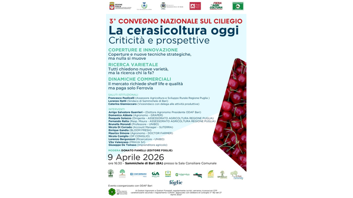 La cerasicoltura italiana si dà appuntamento nel cuore della Puglia. Giovedì 9 aprile 2026, alle ore 16:30, la Sala Consiliare Comunale di Sammichele di Bari ospiterà il 3° Convegno Nazionale sul Ciliegio. L’evento, intitolato “La cerasicoltura oggi: criticità e prospettive”, punta a scattare una fotografia realistica di un comparto strategico per l’economia agricola regionale e nazionale.