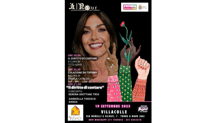 Venerdì 19 settembre, al Villacolle di Torre a Mare, a Bari, l’associazione Al Nour diretta da Angela Cataldo proporrà l’evento “Il diritto di contare”, che culminerà con l’omonimo spettacolo di musica e danza che vedrà protagonisti il Serena Grittani Trio e la ballerina Gabriella Todisco.
