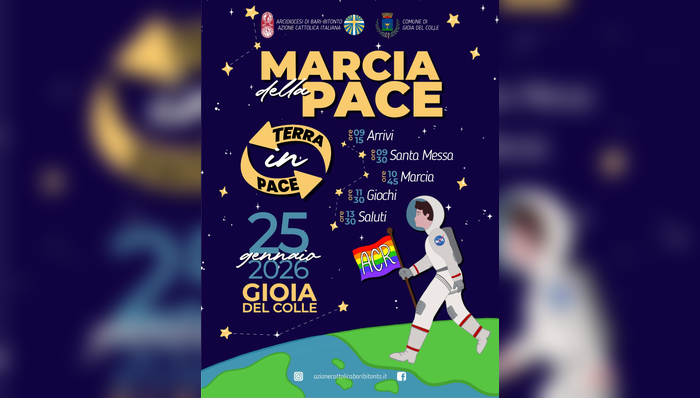 Sarà Gioia del Colle ad accogliere, domenica 25 gennaio 2026, la marcia della pace promossa dall’Azione Cattolica Ragazzi dell’Arcidiocesi di Bari-Bitonto, appuntamento annuale dedicato alla riflessione e alla testimonianza dei valori della pace, della solidarietà e della convivenza civile.