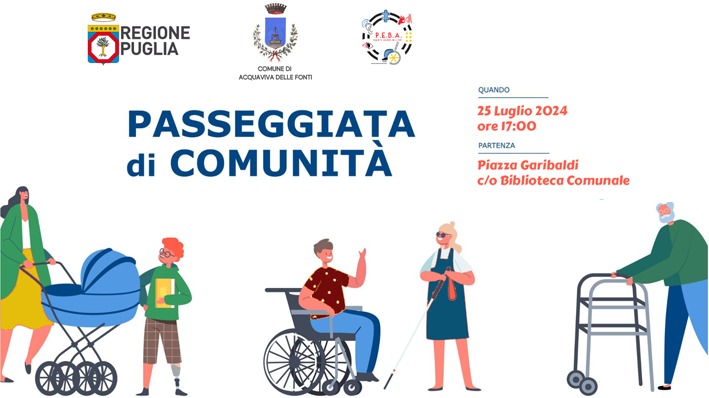 Camminare insieme per segnalare tutti gli ostacoli che impediscono ad Acquaviva delle Fonti di essere una città accogliente e accessibile, per tutti. Con questo scopo il Comune di Acquaviva delle Fonti invita tutti i cittadini a partecipare alla “Passeggiata di Comunità” che si terrà il 25 luglio 2024 alle ore 17:00, con partenza da Piazza Garibaldi, davanti alla biblioteca comunale.