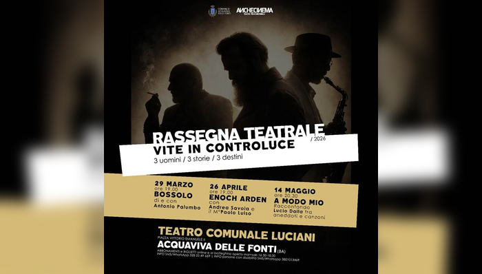 Tre uomini, tre destini, tre riflettori accesi su vite sospese tra passato e futuro. Nasce così “Vite in controluce”, la nuova rassegna teatrale promossa da AncheCinema, in collaborazione con il Comune di Acquaviva delle Fonti, in programma al Teatro Comunale Luciani. Un percorso articolato in tre appuntamenti che intrecciano teatro civile, musica e narrazione, trasformando la scena in uno spazio di memoria e identità.