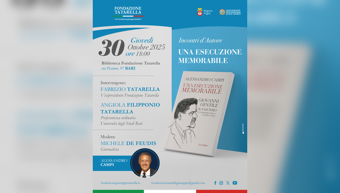 La Fondazione Tatarella ospita un nuovo appuntamento della rassegna Incontri d’Autore con la presentazione del libro di Alessandro Campi “Una esecuzione memorabile: Giovanni Gentile, il fascismo e la memoria della guerra civile” (Le Lettere). L’incontro si terrà giovedì 30 ottobre 2025, alle ore 18.00, nella Biblioteca della Fondazione Tatarella in via Piccinni 97 a Bari.