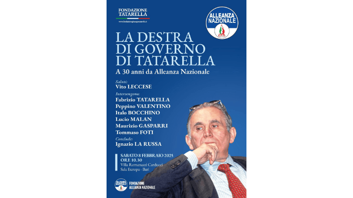 L’8 febbraio 2025, a 26 anni dalla scomparsa di Pinuccio Tatarella, la Fondazione Tatarella si unisce alla Fondazione Alleanza Nazionale per organizzare un convegno significativo nella città di Bari. L’evento, intitolato “La destra di governo di Tatarella. A 30 anni dalla nascita di Alleanza Nazionale”, si terrà nella sala Europa di Villa Romanazzi Carducci alle ore 10.30.