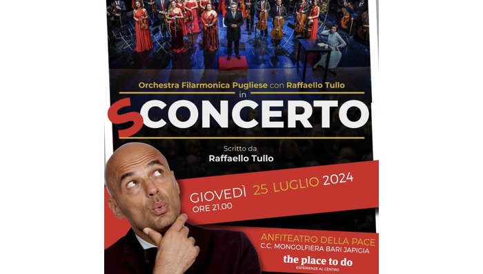 Il Centro commerciale Mongolfiera di Japigia – Bari, in collaborazione con AncheCinema, è lieta di presentare lo spettacolo comico/musicale “SConcerto” con l’Orchestra Filarmonica Pugliese e Raffaello Tullo, che è anche autore e regista dello spettacolo. Lo spettacolo andrà in scena giovedì 25 luglio 2024 alle ore 21.00 presso l’Anfiteatro della Pace di Bari, gestito da AncheCinema.