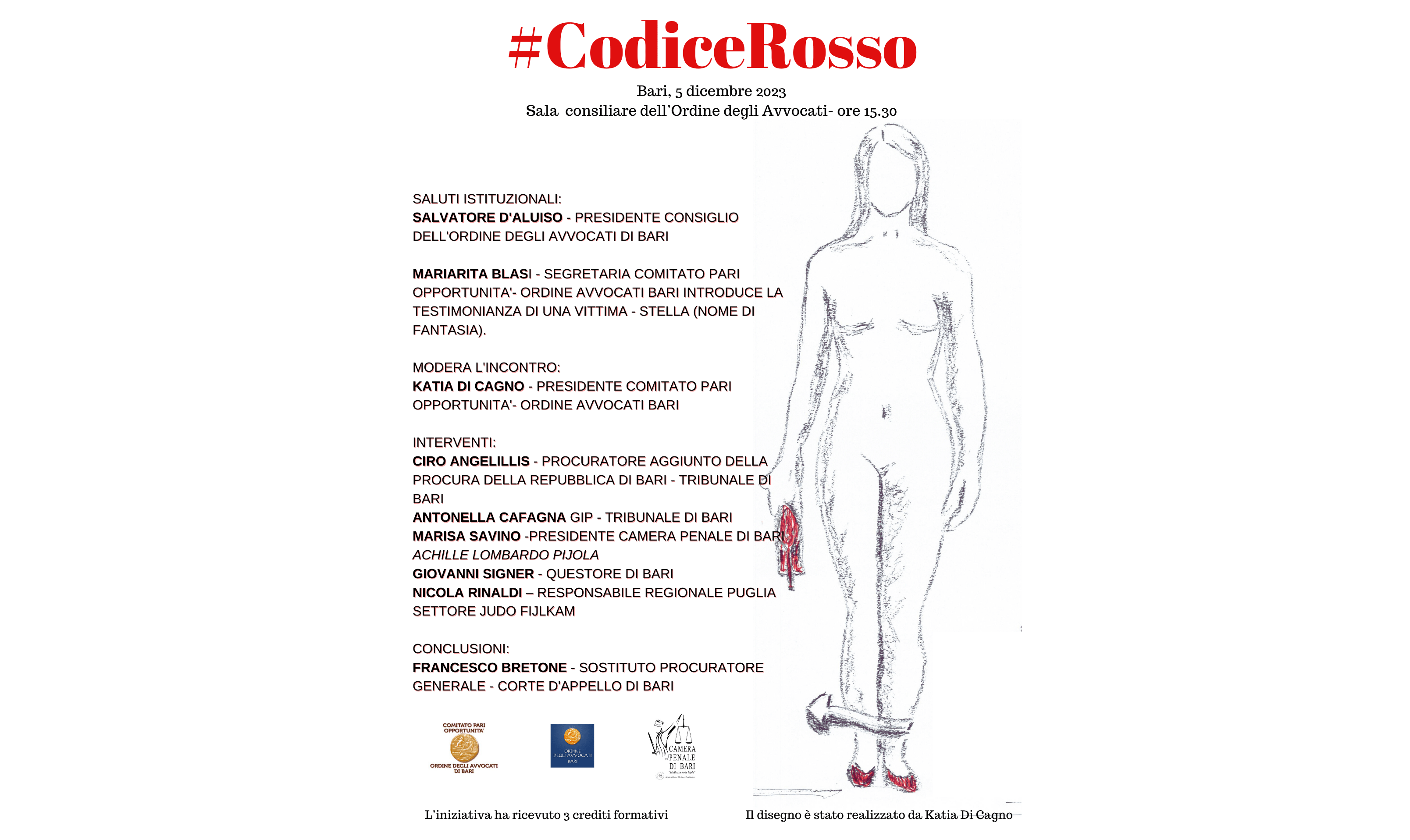 Si comincerà con un’intervista a una vittima da parte dell’avvocata Maria Rita Blasi, componente del Cpo, per poi proseguire i lavori con gli interventi del procuratore aggiunto Ciro Angelillis, della gip Antonella Cafagna, della presidente della Camera penale di Bari, Marisa Savino, del questore di Bari, Giovanni Signer, e del responsabile regionale per la Puglia del settore Judo di Fijilkam, Nicola Rinaldi. Le conclusioni saranno affidate a Francesco Bretone, sostituto procuratore generale alla Corte d’Appello di Bari.