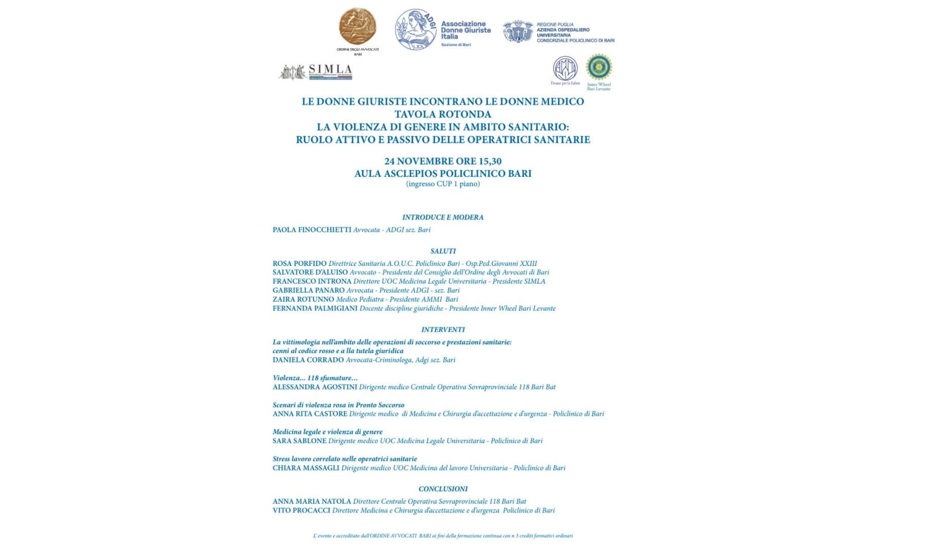 Introdurrà e modererà l’avvocata Paola Finocchietti, rappresentante Adgi, con i saluti di Rosa Porfido, direttrice sanitaria AOUC Policlinico – Ospedale pediatrico Giovanni XIII, Salvatore D’Aluiso, presidente dell’Ordine degli Avvocati di Bari, Francesco Introna, direttore UOC Medicina Legale Universitaria e presidente Silma, Gabriella Panaro, presidente Adgi, Zaira Rotunno, medico pediatra e presidente Ammi Bari, e Fernanda Palmigiani, docente di discipline giuridiche e presidente Inner Wheel Bari Levante.