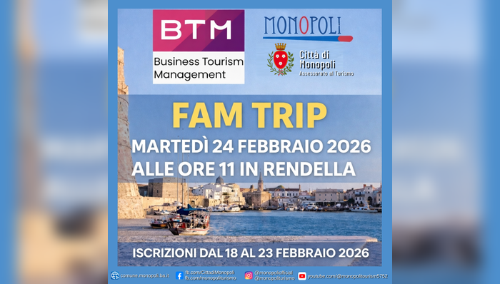 Il Comune di Monopoli, in collaborazione con la società 365 giorni in Puglia srl, organizza un Fam Trip nell’ambito di BTM Italia 2026, in programma il 24 febbraio nella biblioteca Prospero Rendella. L’evento coinvolgerà 40 buyers internazionali specializzati nei segmenti Leisure, MICE, Luxury ed Experience, offrendo loro l’opportunità di conoscere da vicino le attrazioni, i servizi e le potenzialità turistiche della città.