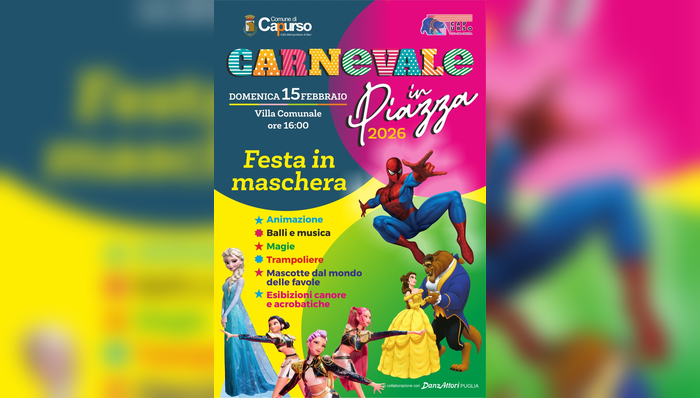 Domenica 15 febbraio, a partire dalle ore 16, la Villa Comunale ospiterà il Carnevale in Villa, un pomeriggio di musica, giochi, balli, trampolieri, magia e mascotte tratte dal mondo delle favole. L’evento, promosso dal Comune in collaborazione con DanzAttori Puglia, offrirà popcorn, zucchero filato e momenti di allegria dedicati ai più piccoli. In caso di maltempo, la festa si svolgerà presso il Pala Livatino.