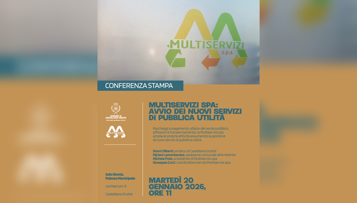 Si terrà martedì 20 gennaio 2026 alle ore 11, presso la Sala Giunta del Palazzo Municipale di Castellana Grotte in via Marconi 9, la conferenza stampa di presentazione dell’avvio dei nuovi servizi affidati dal Comune alla Multiservizi Spa, società in house dell’ente.
