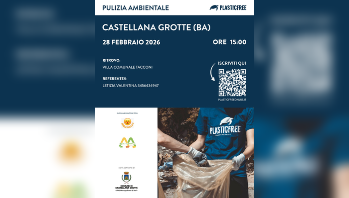L’iniziativa è patrocinata dal Comune di Castellana Grotte ed è gratuita. Per motivi assicurativi è richiesta l’iscrizione preventiva, tramite il QR code presente sulla locandina o attraverso il sito ufficiale plasticfreeonlus.it.