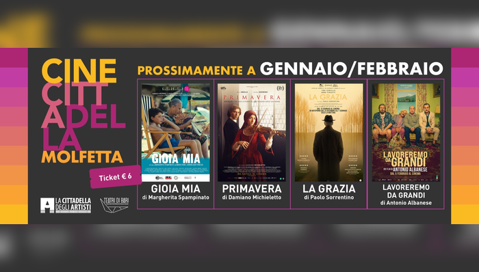 Prosegue anche a febbraio la programmazione cinematografica della Cittadella degli artisti di Molfetta, che propone un cartellone articolato con quattro titoli italiani, distribuiti su più settimane e in alcuni casi in doppia proiezione. Un percorso che attraversa generi e linguaggi diversi, dal cinema d’autore al racconto storico, fino alla commedia corale.