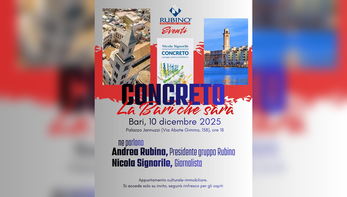 Protagonisti dell’incontro saranno il giornalista Nicola Signorile, autore del volume “Concreto. Paesaggi, materie, architetture”, e Andrea Rubino, presidente del gruppo Rubino, realtà immobiliare che da oltre quarant’anni opera sul territorio con cinque sedi distribuite tra Bari, Barletta, Trani, Modugno e Monopoli. Un confronto pensato per analizzare non solo il presente della città, ma soprattutto le traiettorie che ne disegneranno il futuro.