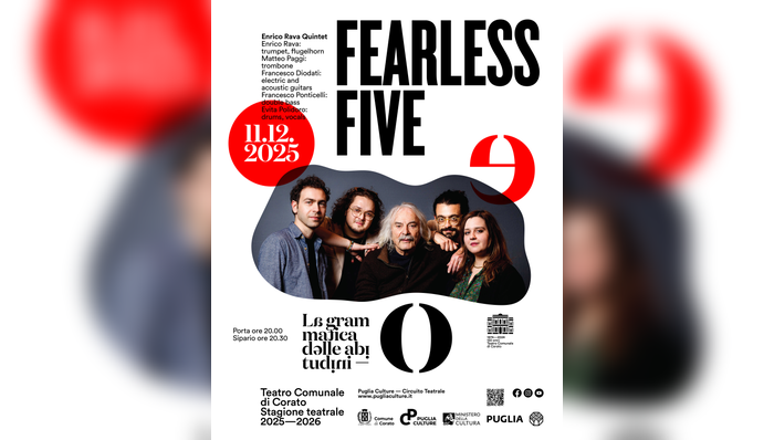 Rava arriva a Corato con il progetto “Fearless Five”, quintetto dal respiro contemporaneo capace di unire la sua esperienza ineguagliabile all’energia e al rischio creativo delle nuove generazioni del jazz. Una formazione che vive di improvvisazione pura, di ascolto reciproco, di una continua trasformazione del suono: un vero e proprio laboratorio musicale in cui tradizione e modernità si intrecciano senza timore di sperimentare.