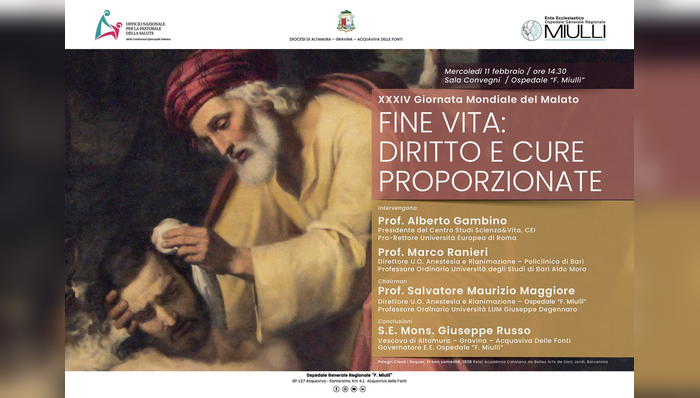Il tema del fine vita e dell’equilibrio tra diritto, scelte cliniche ed etica della cura sarà al centro del convegno “Fine vita: diritto e cure proporzionate”, in programma mercoledì 11 febbraio 2026, a partire dalle ore 14.30, nella Sala Convegni dell’Ospedale “F. Miulli” di Acquaviva delle Fonti.