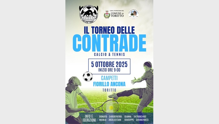 Dopo mesi di preparativi, entusiasmo e spirito di squadra, l’Associazione Equilibrium Toritto, con il patrocinio del Comune e la collaborazione della Pro Loco, è pronta a riportare in vita uno degli appuntamenti più attesi: il Torneo delle Contrade. Una giornata in cui sport, memoria e comunità si intrecciano in un evento che va oltre la competizione.