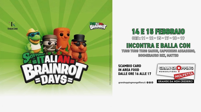 Sabato 14 e domenica 15 febbraio il Gran Shopping di Molfetta ospita gli Italian Brainrot Days, due giornate dedicate ai più piccoli e ai personaggi più popolari del mondo Brainrot. L’evento propone spettacoli, giochi e attività in compagnia dei protagonisti della serie Skifidol™ Italian Brainrot.