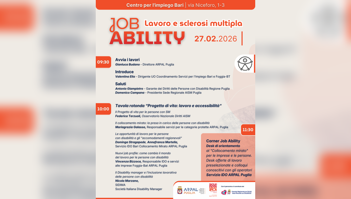 Si terrà venerdì 27 febbraio 2026, presso il Centro per l’impiego di Bari in via Niceforo 1-3, l’incontro “Job Ability: lavoro e sclerosi multipla”, un’iniziativa rivolta a persone con disabilità, aziende e operatori del settore del lavoro inclusivo.