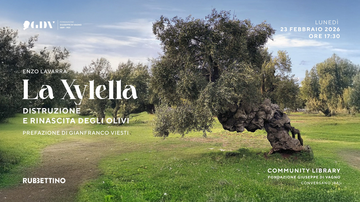 Oggi, lunedì 23 febbraio 2026 alle ore 17.30, la Community Library della Fondazione Di Vagno in via S. Benedetto a Conversano ospiterà la presentazione del libro “La Xylella. Distruzione e rinascita degli olivi” di Enzo Lavarra, già parlamentare europeo, vicepresidente della Commissione Agricoltura, ex presidente del Parco Regionale delle Dune Costiere e membro del Board di Europarc Federation.