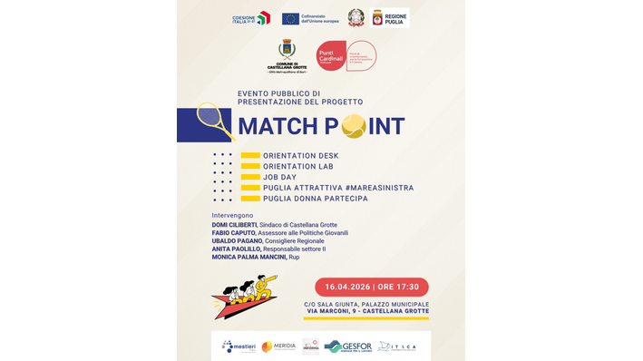 Trovare la propria strada nel mondo del lavoro non sarà più un percorso a ostacoli per i cittadini di Castellana Grotte. Verrà presentato giovedì 16 aprile, presso la sala giunta del Palazzo Municipale, “Match Point”, l’innovativo progetto di orientamento alla formazione e all’impiego promosso dall’Amministrazione Comunale.