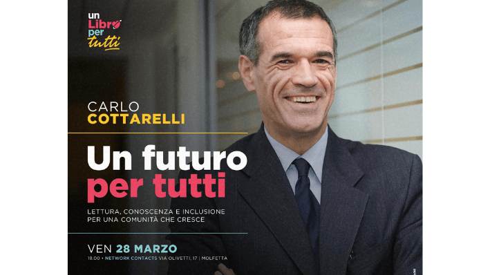 Venerdì 28 marzo, alle 10, la sede di Network Contacts a Molfetta (via Olivetti, 17) ospiterà l’evento di chiusura del progetto “Un libro per Tutti”, creato e promosso dalla onlus Contasudinoi, con l’intervento dell’economista Carlo Cottarelli. Un’occasione imperdibile per riflettere sull’importanza della lettura inclusiva e sull’accesso alla conoscenza come strumento di crescita sociale ed economica.