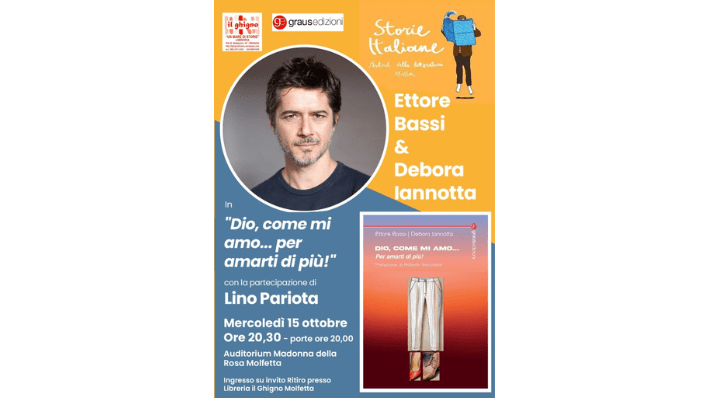 Un incontro che unisce teatro, letteratura e introspezione. Mercoledì 15 ottobre 2025, alle 20.30 (porte aperte alle 20.00), l’attore Ettore Bassi sarà a Molfetta, all’Auditorium della Madonna della Rosa (viale Papa Giovanni Paolo II, 121), per presentare il suo libro “Dio, come mi amo… per amarti di più” (Graus Edizioni), scritto a quattro mani con Debora Iannotta e con la prefazione di Roberto Vecchioni.