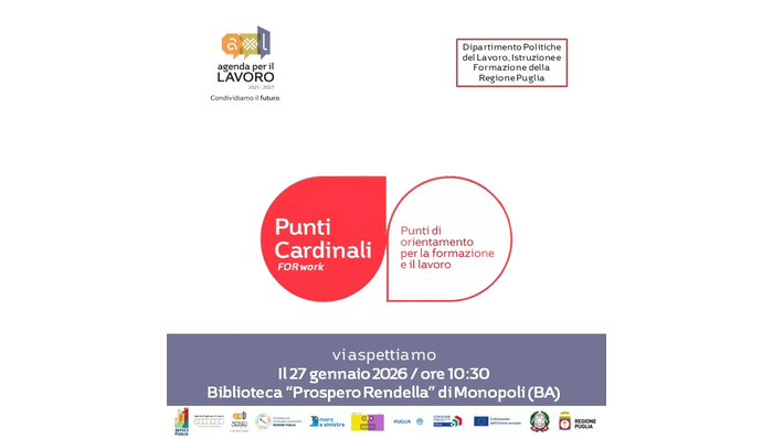 Prosegue il ciclo di incontri territoriali legati all’Avviso “Punti Cardinali for Work”, iniziativa regionale per l’orientamento alla formazione e al lavoro. La prossima tappa è prevista martedì 27 gennaio 2026, alle 10.30, presso la Biblioteca civica “Prospero Rendella” di Monopoli.