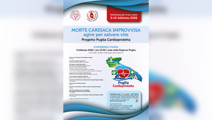 Rafforzare la cultura della prevenzione e rendere i cittadini protagonisti nella gestione delle emergenze cardiache. È questo l’obiettivo del progetto “Puglia Cardioprotetta”, al centro dell’incontro in programma lunedì 9 febbraio 2026 presso la sede della Regione Puglia a Bari, che riunirà istituzioni, cardiologi, mondo della scuola e sanità pubblica.