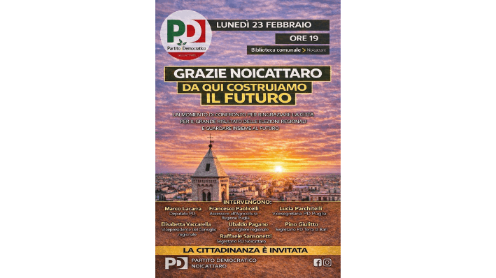 La sezione di Noicattaro del Partito Democratico ha scelto di trasformare il consenso raccolto alle ultime elezioni regionali in un momento di riflessione pubblica. Lunedì 23 febbraio, alle ore 19 nella biblioteca comunale, il circolo guidato dal segretario Raffaele “Lello” Sansonetti ha organizzato un incontro con i candidati più votati in città alle regionali pugliesi. Un appuntamento che va oltre il semplice ringraziamento agli elettori: sul tavolo c’è già il futuro amministrativo del Comune, con le elezioni del 2027 che iniziano a delineare scenari e strategie.