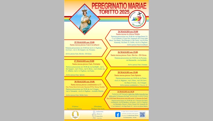 Toritto si prepara a vivere un momento di profonda spiritualità e devozione con la “Peregrinatio Mariae 2025”, un evento che rientra nel Giubileo della Speranza. Durante il mese di maggio, noto anche come mese mariano, la comunità si unirà nel culto della Beata Vergine Maria attraverso una serie di celebrazioni e processioni.