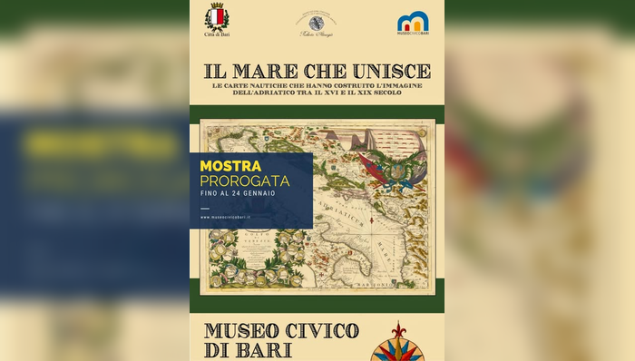 È stata prorogata fino al 24 gennaio la mostra “Il mare che unisce. Le carte nautiche che hanno costruito l’immagine dell’Adriatico tra il XVI e il XIX secolo”, ospitata al Museo Civico di Bari e organizzata dall’Associazione Italiana di Collezionisti di Cartografia Antica “Roberto Almagià” in collaborazione con il museo cittadino.