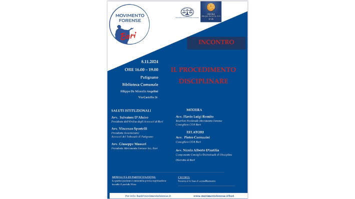 Il Movimento Forense di Bari, in collaborazione con l’Ordine degli Avvocati di Bari, organizza un importante evento formativo dedicato al “Procedimento Disciplinare”. L’appuntamento è fissato per l’8 novembre 2024, dalle 16 alle 19, nella biblioteca comunale Filippo De Miccolis Angelini a Putignano, situata in Via Castello 26.