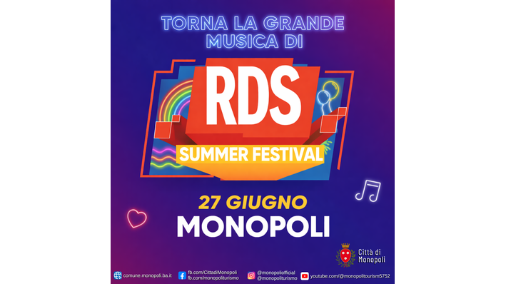 Per il terzo anno consecutivo, la città di Monopoli è stata inserita nel calendario dell’RDS Summer Festival. L’appuntamento locale è fissato per il prossimo 27 giugno, all’interno di un breve tour nazionale che quest’anno toccherà solo quattro località italiane tra metà giugno e l’inizio di luglio.