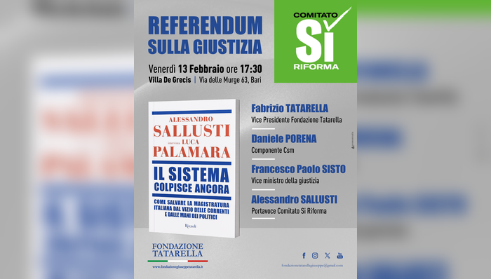 All’evento interverranno Fabrizio Tatarella, vicepresidente della Fondazione Tatarella, Daniele Porena, componente laico del Consiglio Superiore della Magistratura, e il viceministro della Giustizia Francesco Paolo Sisto. L’incontro sarà l’occasione per illustrare nel dettaglio le ragioni del Sì al referendum e per presentare l’ultimo libro-intervista di Sallusti con Luca Palamara, “Il Sistema colpisce ancora”, che affronta i nodi irrisolti del funzionamento della magistratura italiana.