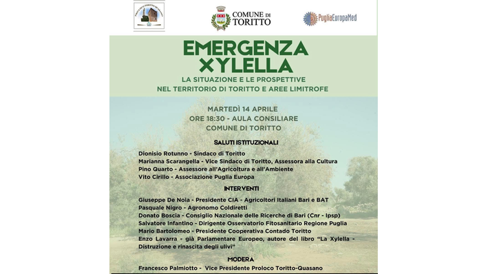 Il Comune di Toritto, in sinergia con la Pro Loco Toritto-Quasano e PugliaEuropaMed, promuove un momento di approfondimento cruciale per il futuro dell’agricoltura locale. Martedì 14 aprile, alle ore 18:30, l’Aula Consiliare del Comune diventerà il centro di un dibattito tecnico e istituzionale dal titolo “Emergenza Xylella – La situazione e le prospettive nel territorio di Toritto e aree limitrofe”.